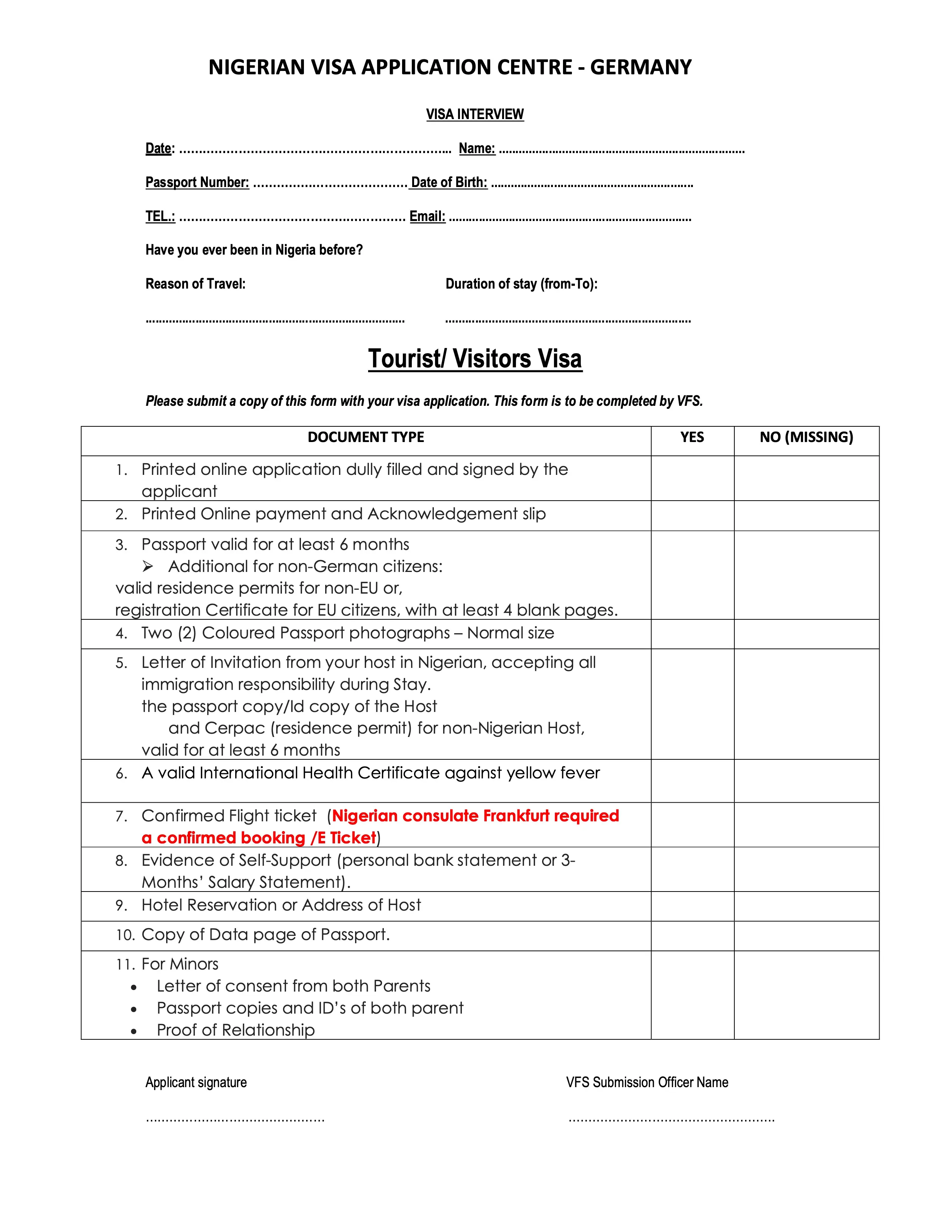 Despite what some outdated information online suggests, the in-person appointments are not conducted at the Nigerian missions. They (might) take applications for different visa types, but the tourist visas are exclusively handled through their private visa application service provider VFS Global (official domain: vfsglobal.com). So you’ll have to visit either the Berlin or Frankfurt office.